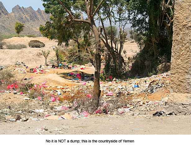 Pink plastic bags  blown from the market line the hilly desert landscape for miles as we continue  our way north.  They catch on the dry  shrubs and puff in the wind like limp balloons.   “The national flower of Yemen,”  I joke.  But as we drive through one  small town after another, the immense trash problem is no joke.  The bags are joined by piles of garbage  everywhere.  Apparently, wherever a can  or bottle is consumed, it is simply dropped.